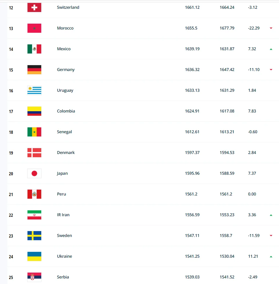Міжнародна федерація футболу на своєму сайті оприлюднила черговий рейтинг збірних. Україна, у порівнянні з попередньою версією, піднялась одразу на шість сходинок і посідає тепер 24-те місце, набравши 1541,25 бала.