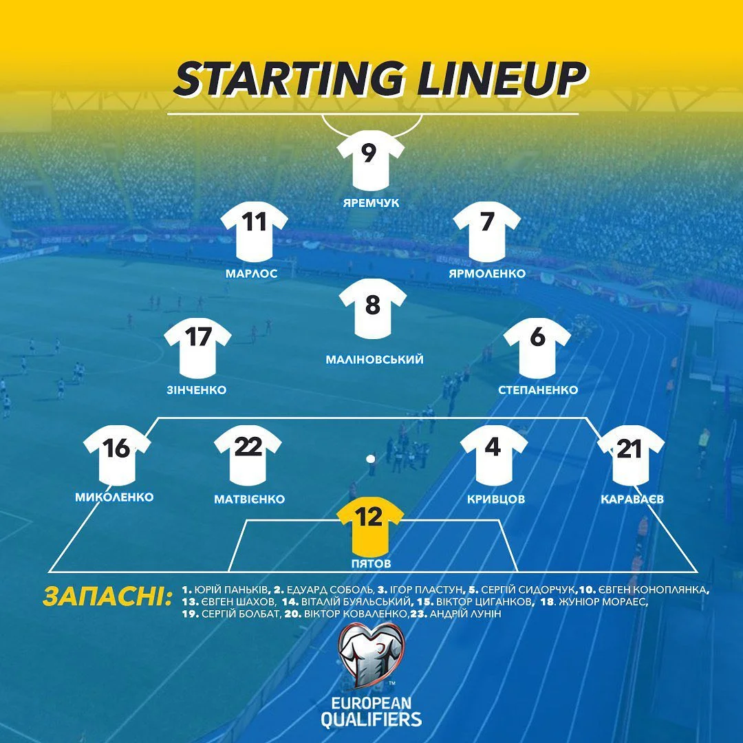 Україна: Пятов (к) – Караваєв, Кривцов, Матвієнко, Миколенко – Степаненко – Ярмоленко, Зінченко, Маліновський, Марлос – Яремчук