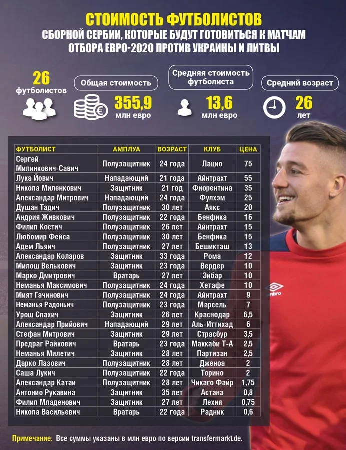 Збірна Сербії має загальну вартість 356 млн євро, повідомляє Команда 1, посилаючись на дані німецького порталу Transfermarkt.