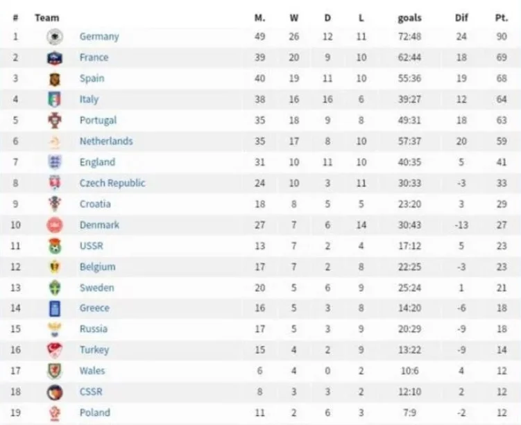 А от лідирує в загальному заліку збірна Німеччини. Бундестім провела на чемпіонатах Європи 49 поєдинків – найбільше серед усіх команд. В активі німців 90 очок – 26 перемог, 12 нічиїх та 11 поразок. Друге місце посідає Франція, третє – Іспанія. Саме іспанці та німці найчастіше вигравали Євро – по 3 рази.