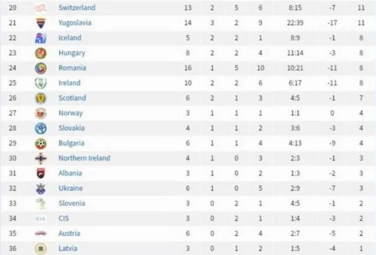 У зведеній турнірній таблиці за всю історію фінальних частин чемпіонату Європи Україна розмістилася на 32-й позиції з 36-ти команд. Нижче за нашу збірну перебувають лише збірні СНД (грала на Євро-1992), Словенії, Австрії та Латвії. Щоправда, варто зазначити, що українські футболісти регулярно складали кістяк збірної СРСР, яка, наприклад, у 1988 році дійшла до фіналу, поступившись Нідерландам.