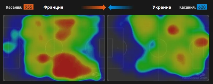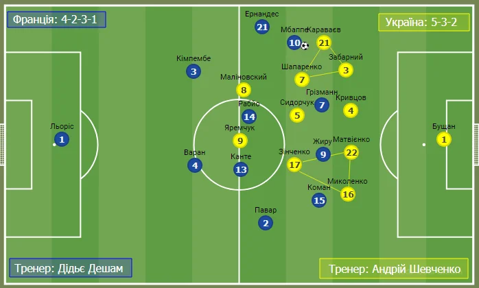 Україна віддала чемпіонам світу м'яч і територію, але кваліфіковано перекрила супернику фланги та півфланги. Гості не висмикувалися у високий пресинг, тримаючи компактний середній та низький блоки. Приблизно до 35 хвилини господарі мали суттєву перевагу, але з часом "синьо-жовті" заспокоїлися, адаптувалися, підіймали вище лінію оборони та почали переходити у фазу позиційної атаки. Гол Сидорчука/Кімпембе можна вважати винагородою за організовані дії у деструктивній фазі. Математично нас знищили, але з погляду на тактику, більшу частину матчу команда Дешама не знала, що робити з катеначчо Шевченка/Тассотті/Малдери. Звісно, українці планували ефективніше виходити у швидкі атаки, однак на це часто бракувало сил.