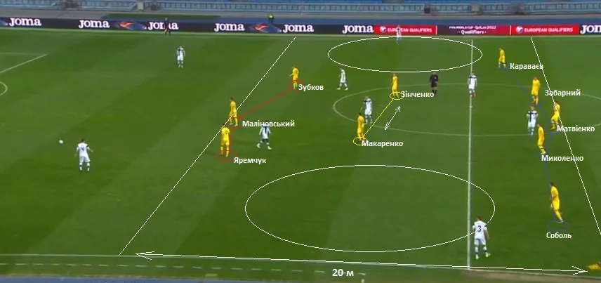 У середньому блоці Зінченко часто підіймався у лінію нападу до Яремчука та Маліновського і по суті команда у цій фазі підтримувала структуру 5-2-3. Якщо ж суперник переходив з м'ячем на нашу половину, Зінченко знову повертався у лінію до Сидорчука і Шапаренка.