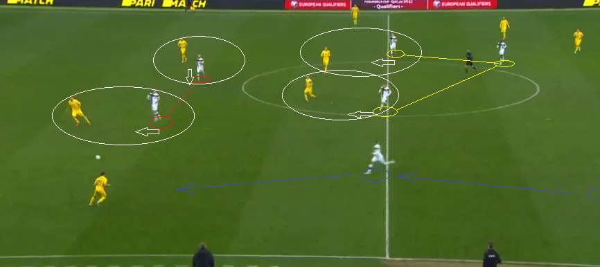 Було помітно, що у теорії Україна мала б перевантажувати лівий фланг та півпростір і саме у цій зоні часто утворювався умовний ромб з Соболем, Миколенком, Яремчуком, а також – з Маліновським або Зінченком, залежно від ситуації. Капітан нашої національної команди страхував Миколенка, який підключався до позиційних атак по півфлангу. Взаємодія Віталія з Соболем була інтригуючим моментом, але на практиці нічого хорошого з цього не вийшло. План був цікавим, проте відчувалося, що гравцям постійно потрібен час, аби осмислити ситуацію. Дивно, що наш тренерський штаб пішов на таку авантюру. За кілька днів поставити ефективну гру у позиційному нападі з новою структурою – майже неможливо.
