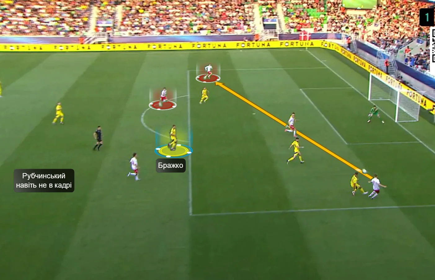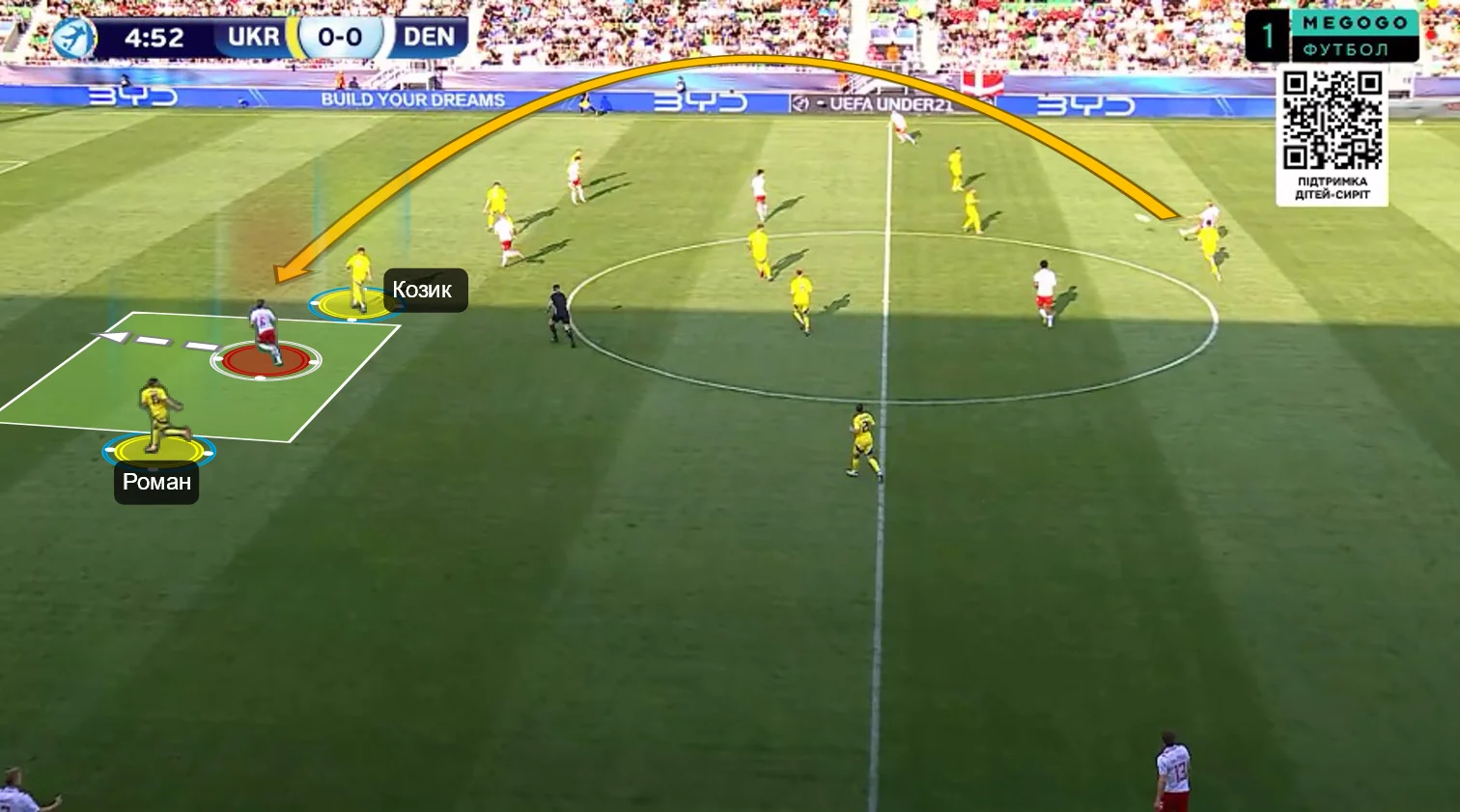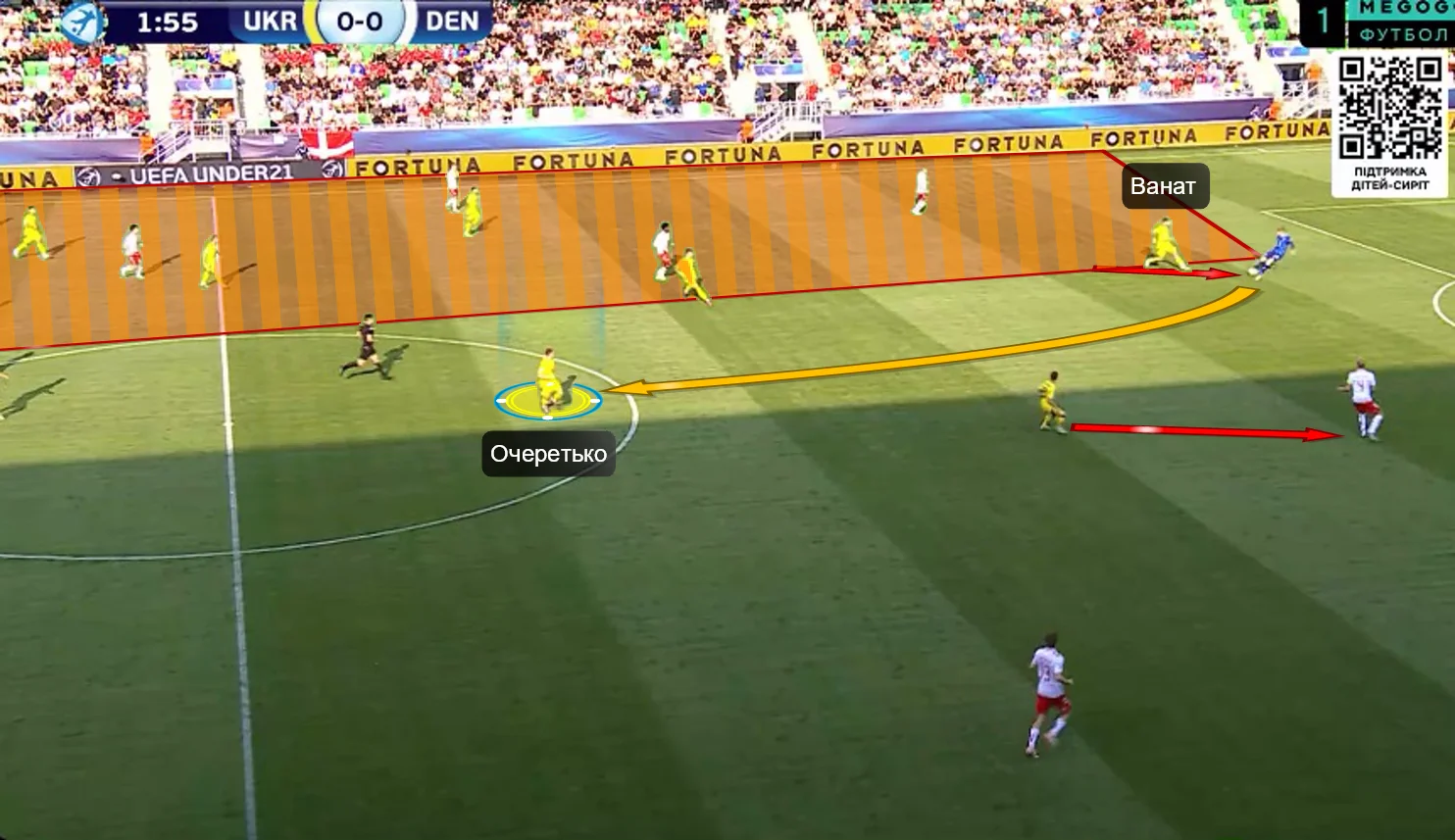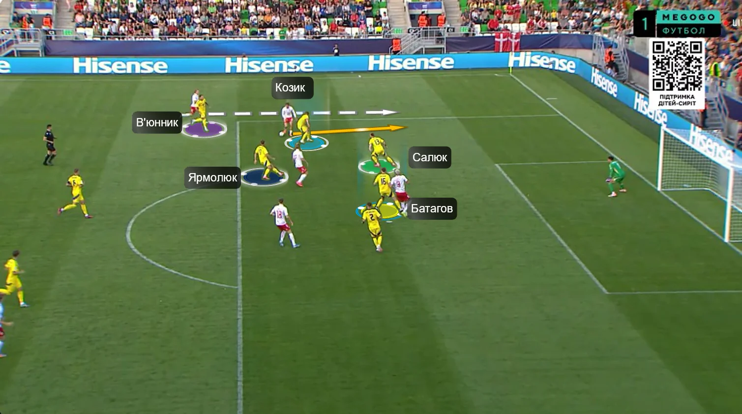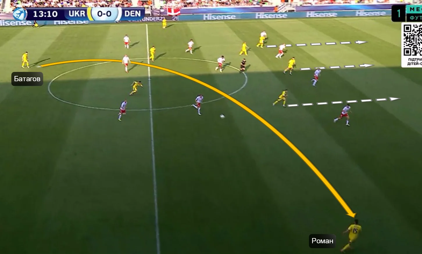 Перше, що впадало у вічі у грі нашої збірної – це активне використання сильних якостей центрбеків. Батагов і Козик розкидували точні діагоналі по флангах, де завжди створювалась ширина. Футболіст, який приймав такі переведення, часто мав продовження у вигляді передачі в глибину (тобто за спини на хід).