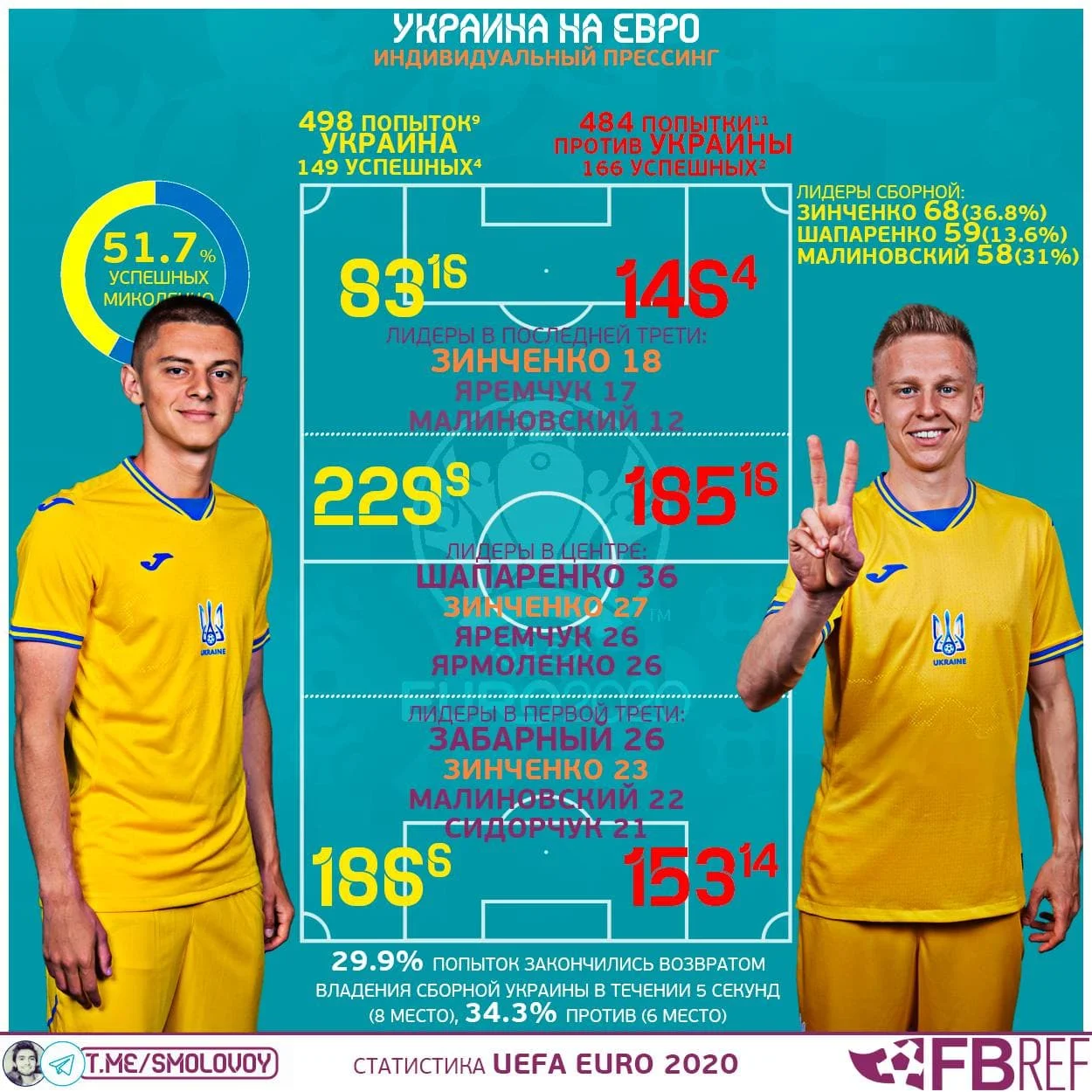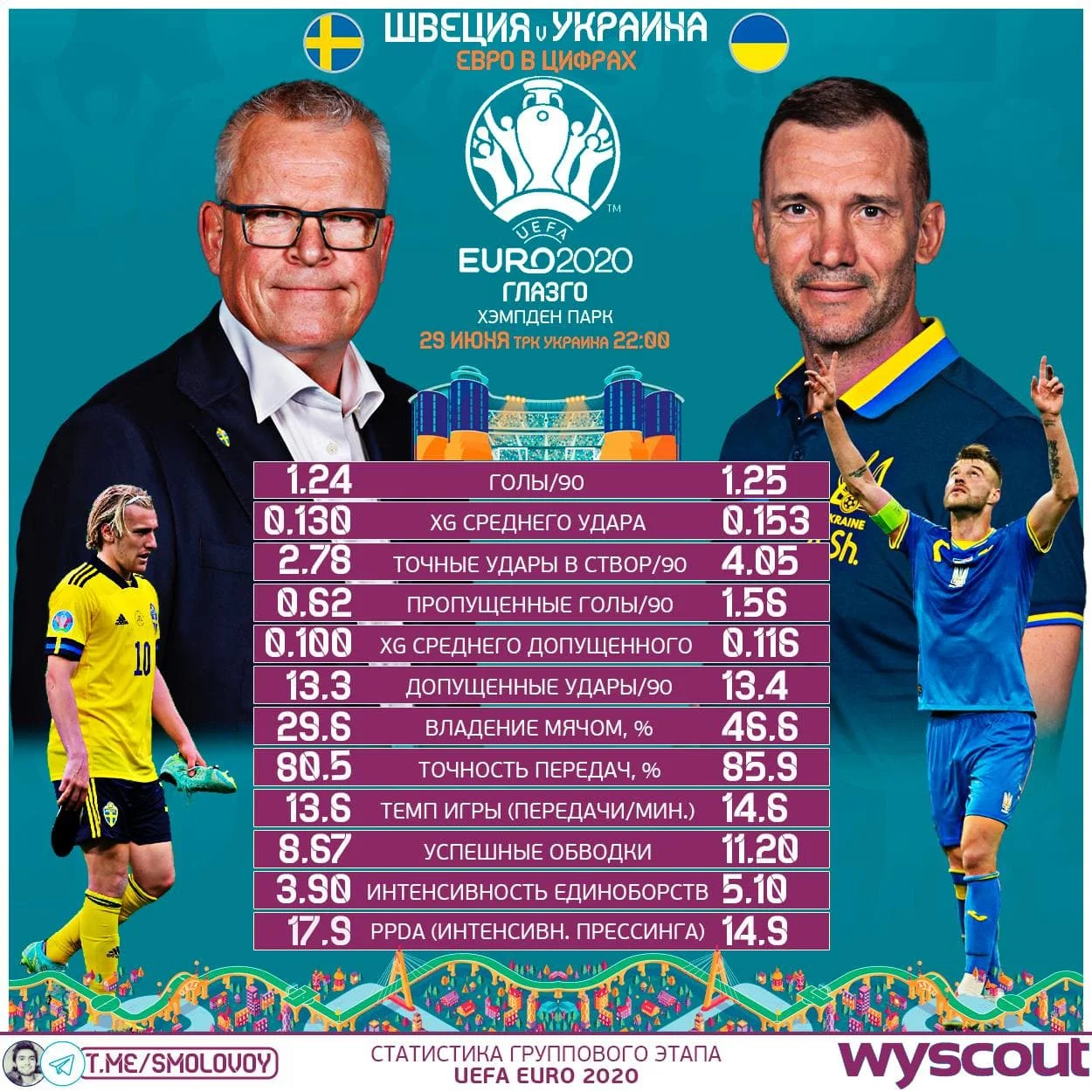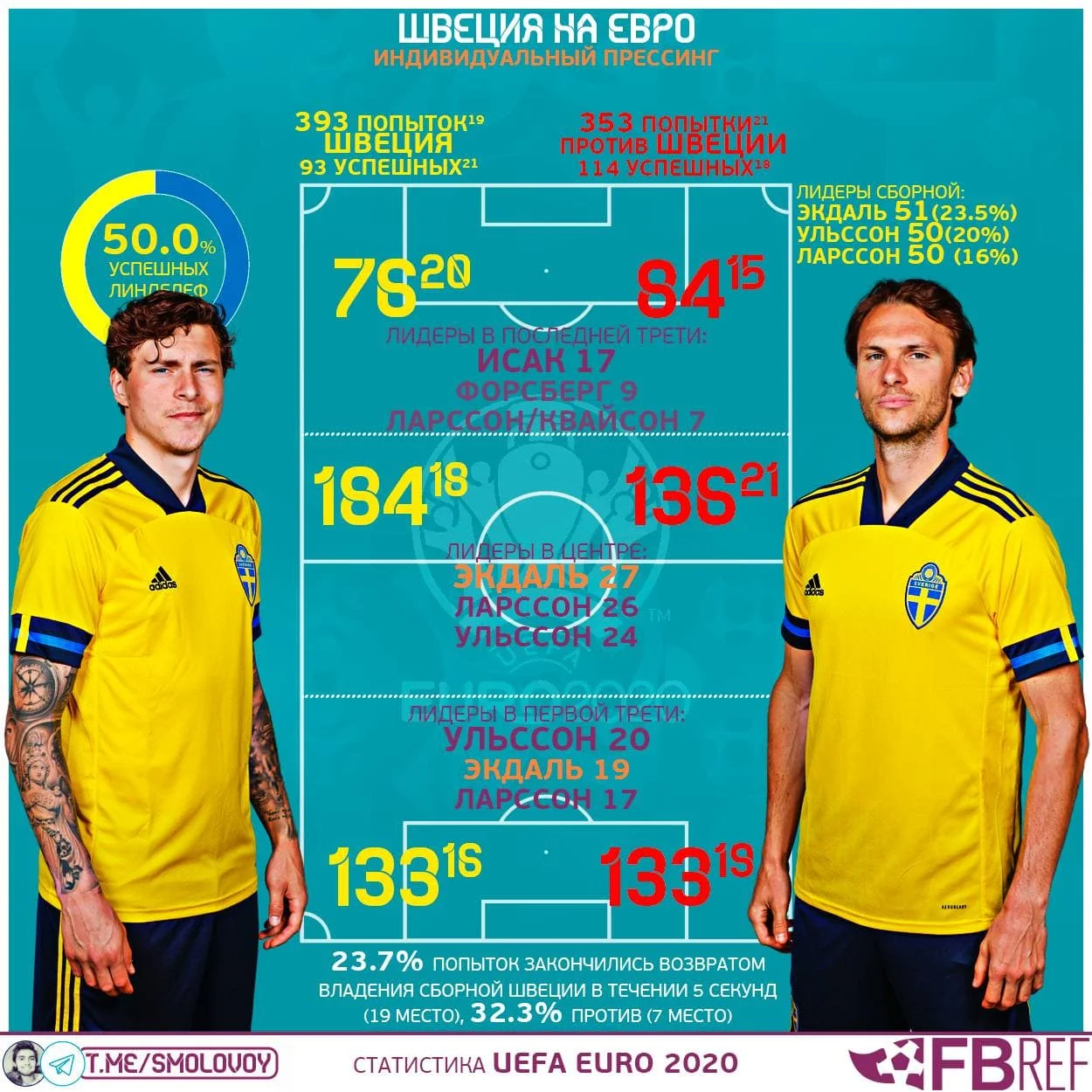 Якщо не вийде повторити нам пекло, можемо вибороти наш шанс. Шведи значно гірше, ніж ми, тиснуть у спробі відібрати м'яч – за успішністю пресинг-дій обходять на турнірі якихось 3 збірні, тоді як ми поступаємося тільки трьом. Найкраще вміють заганяти в кут опорники і номінальний вінгер Ларссон, який також любить зміщуватися в центр. Але й їхні цифри не вражають: від 16 до 23,5 відсотка успішності. Для порівняння Зінченко пресингує з успішністю 36,8%, у Маліновського 31% повернень володіння після тиску, а в Миколенка взагалі – 51,7%.