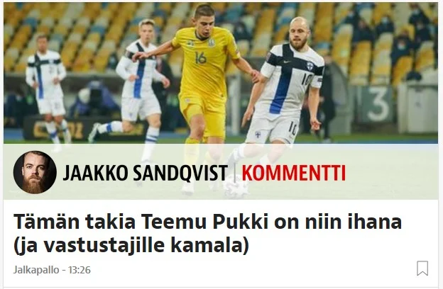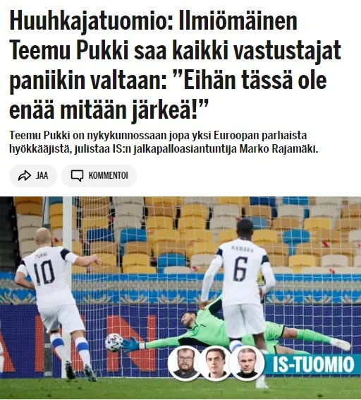 Журналіст ltalehti Яакко Сандквіст пояснює, чому Пуккі – один із найкращих фінських футболістів за всю історію. "Фанатам "сов" неабияк пощастило, що він вийшов на пік форми саме зараз. Останні три голи Пуккі припали на кваліфікацію ЧС, у четвер та неділю. Спочатку він відзначився дублем у воротах Боснії і Герцеговини, а згодом шокував міцну збірну України.