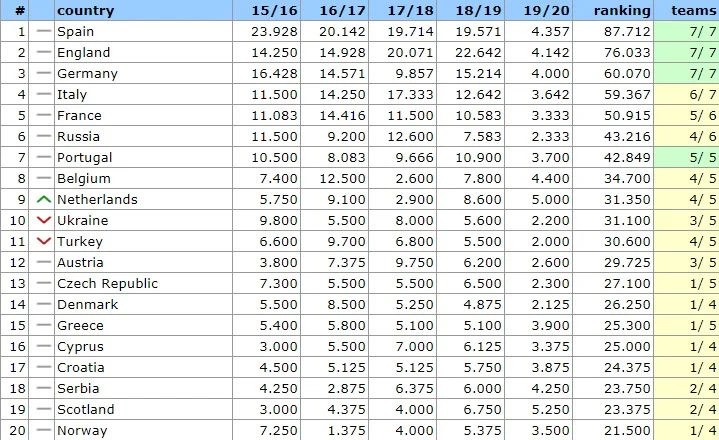 Непереконливими виступами наших команд у європейських турнірах скористали нідерландці, які випередили Україну та забрали 9-ту сходинку собі. Зараз сумарний бал України становить – 31,100, Нідерланди – 31,350. Продовжує очолювати таблицю Іспанія, в доробку якої 87,712 балів.