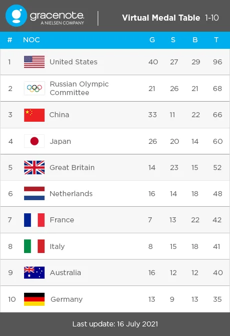 Список потенційних лідерів очолила збірна США. Компанія вважає, що американські атлети завоюють 96 трофеїв – 40 золотих, 27 срібних та 29 бронзових. На друге місце експерти поставили Олімпійський комітет Росії (ОКР), атлети якого виступлять під нейтральним прапором та без гімну своєї держави. Вони спрогнозували їм 68 медалей – 21 золоту, 26 срібних і 21 бронзову. У трійку фаворитів також потрапив Китай, спортсменам цієї країни пророкують 66 нагород – 33 золотих, 11 срібних, 22 бронзові.