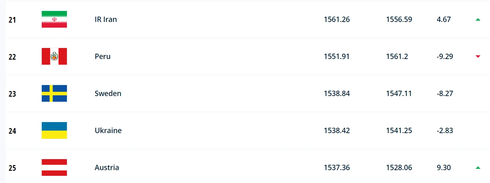 В другій половині таблиці Швейцарія піднялася на 13 сходинку, а Колумбія на 16, посунувши Уругвай на 17 місце.