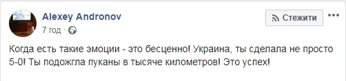 "Коли є такі емоції – це безцінно! Україно, ти зробила не просто 5:0! Ти підпалила пукани в тисячі кілометрів! Це успіх!", – написав Андронов на своїй сторінці у Фейсбук.