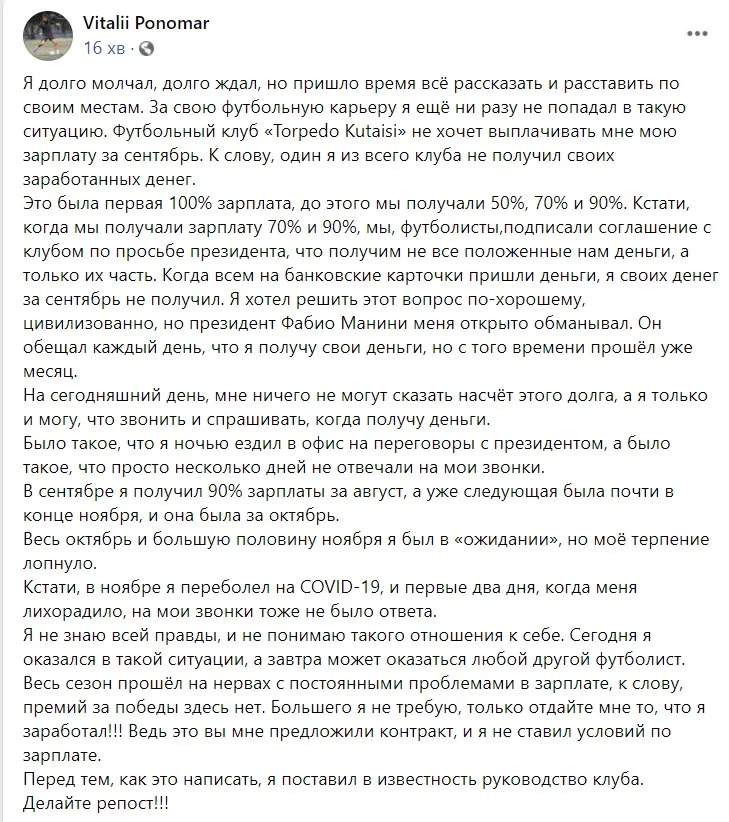 "Я один зі всього клубу не отримав своїх зароблених грошей. Не знаю всієї правди і не розумію такого ставлення до себе. Віддайте мені те, що я заробив", – написав Пономар у Facebook.