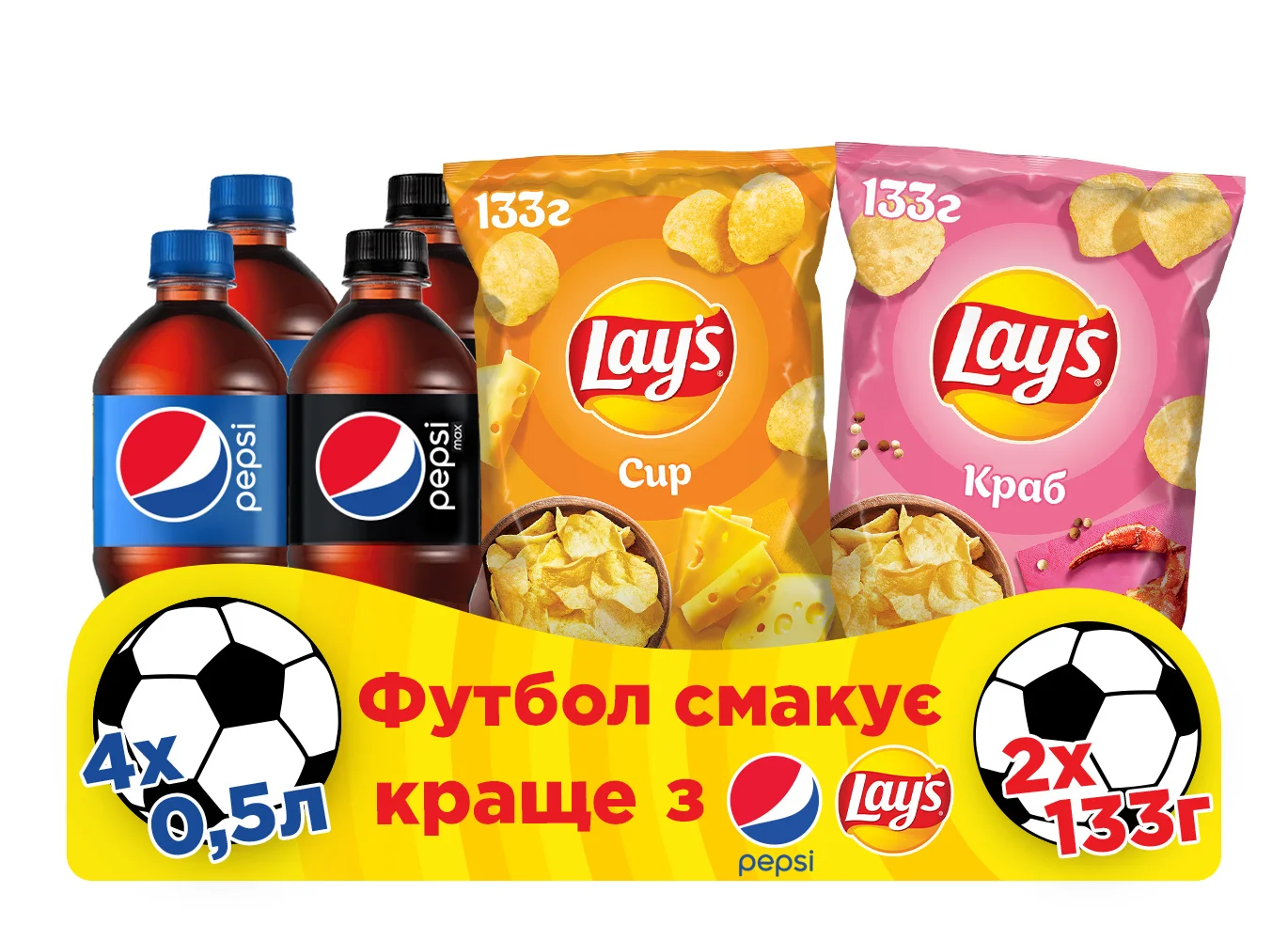 Влаштуй собі максимально футбольний відпочинок із боксом для вболівальників від Lay's та Pepsi! Улюблені чипси та смачний напій зроблять перегляд матчів Ліги чемпіонів незабутнім.