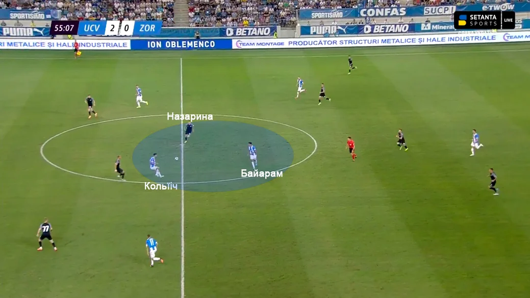 Часто в центр поля ще й опускався нападник Кольїч, залишаючи Назарину на розрив. Саме так Універсітатя створила момент за хвилину до третього голу – високий пресинг Зорі розбили довгою передачею в центр, де Назарина залишився один проти двох. Кольїч спокійно виконав скидку й розігнав атаку.