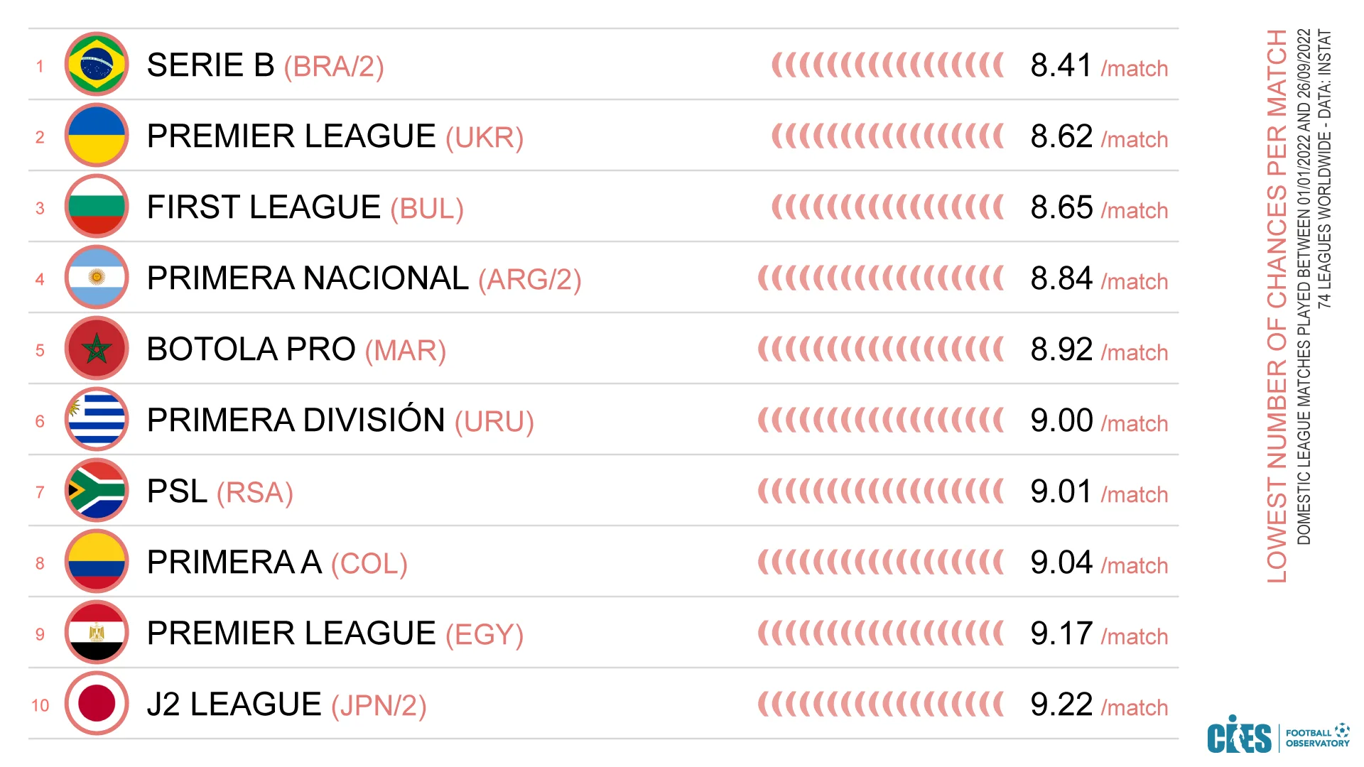 На іншому полюсі німецька Бундесліга (13 гольових нагод за гру), нідерландська Ерстедивізі, норвезька Елітесеріен, катарська Старс-ліга та австралійська А-ліга.