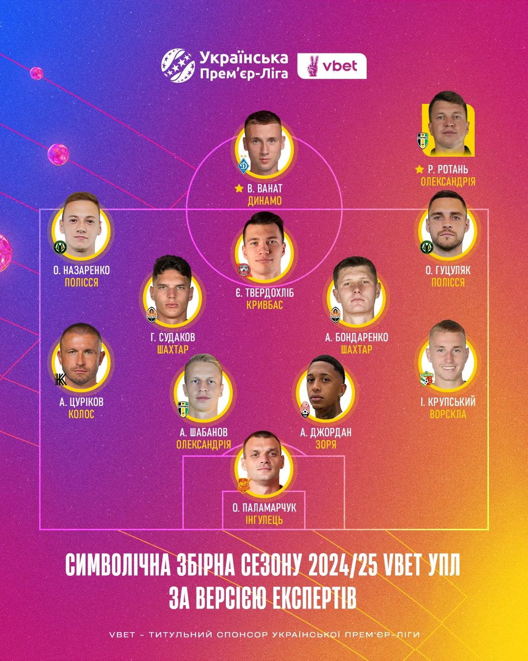УПЛ продовжує підбивати підсумки сезону 2024/25, склавши символічну збірну з гравців на основі збірних турів, які формувалися разом з ведучими, експертами, коментаторами УПЛ ТБ та представниками провідних спортивних ЗМІ України.