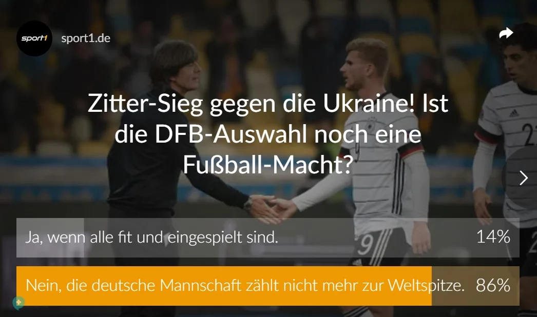 Видання запитало у своїх читачів, чи залишається збірна Німеччини великою силою у міжнародному футболі. 86% респондентів відповіли, що Бундестім більше не входить у когорту найкращих!
