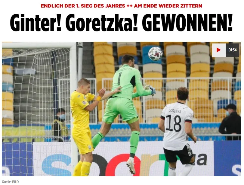 Sport Bild коротко резюмує матч і розставляє гострі акценти: Йогі Льов грає без чистого форварда, а роботу нападників виконують захисники (гол Рюдігера-Гінтера); гол Горецтки після мегапомилки Бущана – це фарс; 17573 вболівальники на стадіоні – той дивовижний момент, коли німці шоковані заповненим стадіоном в Україні ("через коронавірус такої картини в Німеччині ми давно не бачили").