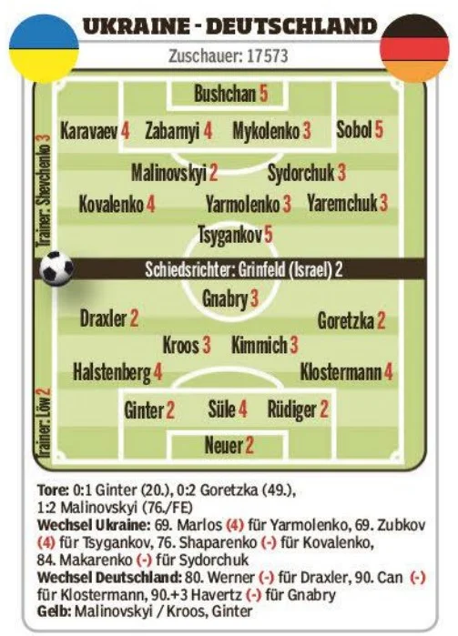 Bild am Sonntag презентував оцінки футболістам обох збірних (традиційне нагадування, що в Німеччині найвища оцінка – 1). У складі гостей одразу п'ять гравців отримали високі 2 бали, а серед українців таку оцінку поставили лише Руслану Маліновському. Хавбек Аталанти вдруге поспіль має визнання європейської преси після матчів збірної. Найгірші оцінки від BamS отримали Циганков, Соболь і Бущан. Сейви Георгія затьмарила груба результативна помилка.