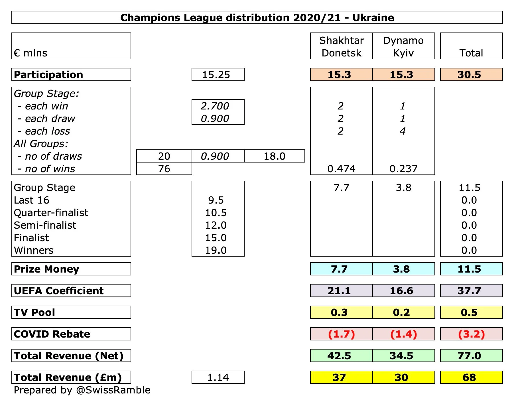 Додавши до цього гарантовану виплату за вихід у груповий етап у розмірі 15,25 млн євро, побачимо підсумковий дохід. Також варто відзначити, що Шахтар (1,7 млн) і Динамо (1,4 млн) втратили частину через коронавірус.