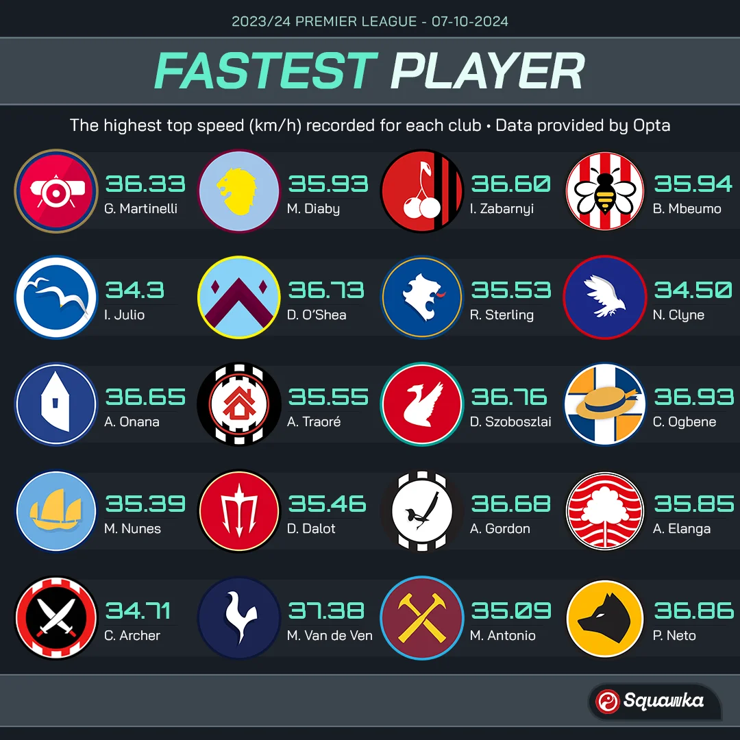 Аналітичний сайт Squawka визначив гравців у кожній команді АПЛ, які розвинули найбільшу швидкість у поточному сезоні.