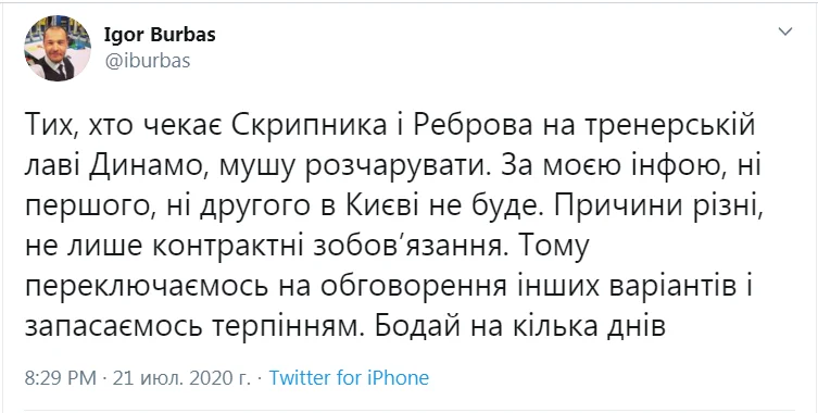 "Тих, хто чекає Скрипника і Реброва на тренерській лаві Динамо, мушу розчарувати. За моєю інфою, ні першого, ні другого в Києві не буде.