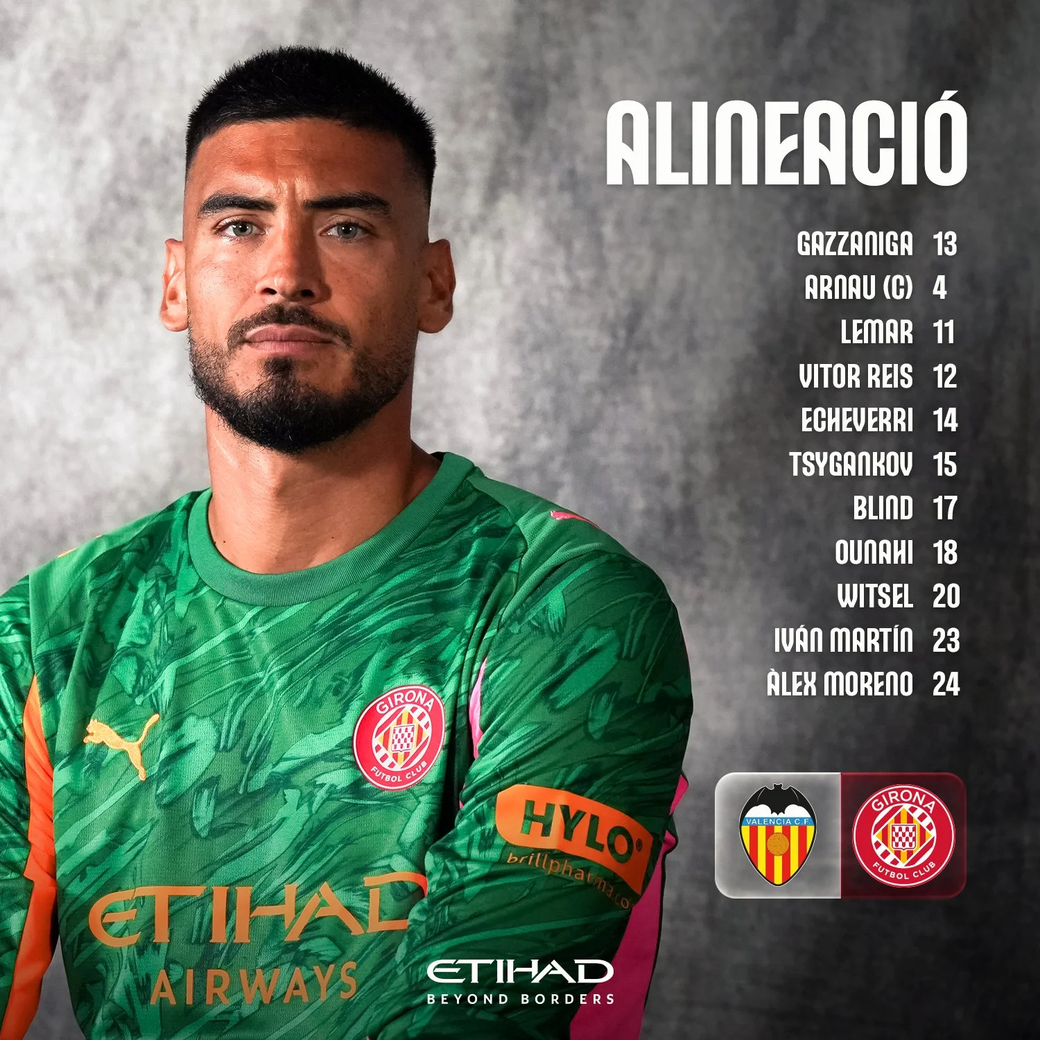 Стартовий склад Жирони: Гассаніга – Арнау Мартінес, Вітор Рейс, Блінд, Алекс Морено – Вітсель, Іван Мартін – Циганков, Лемар, Унахі – Ечеверрі.