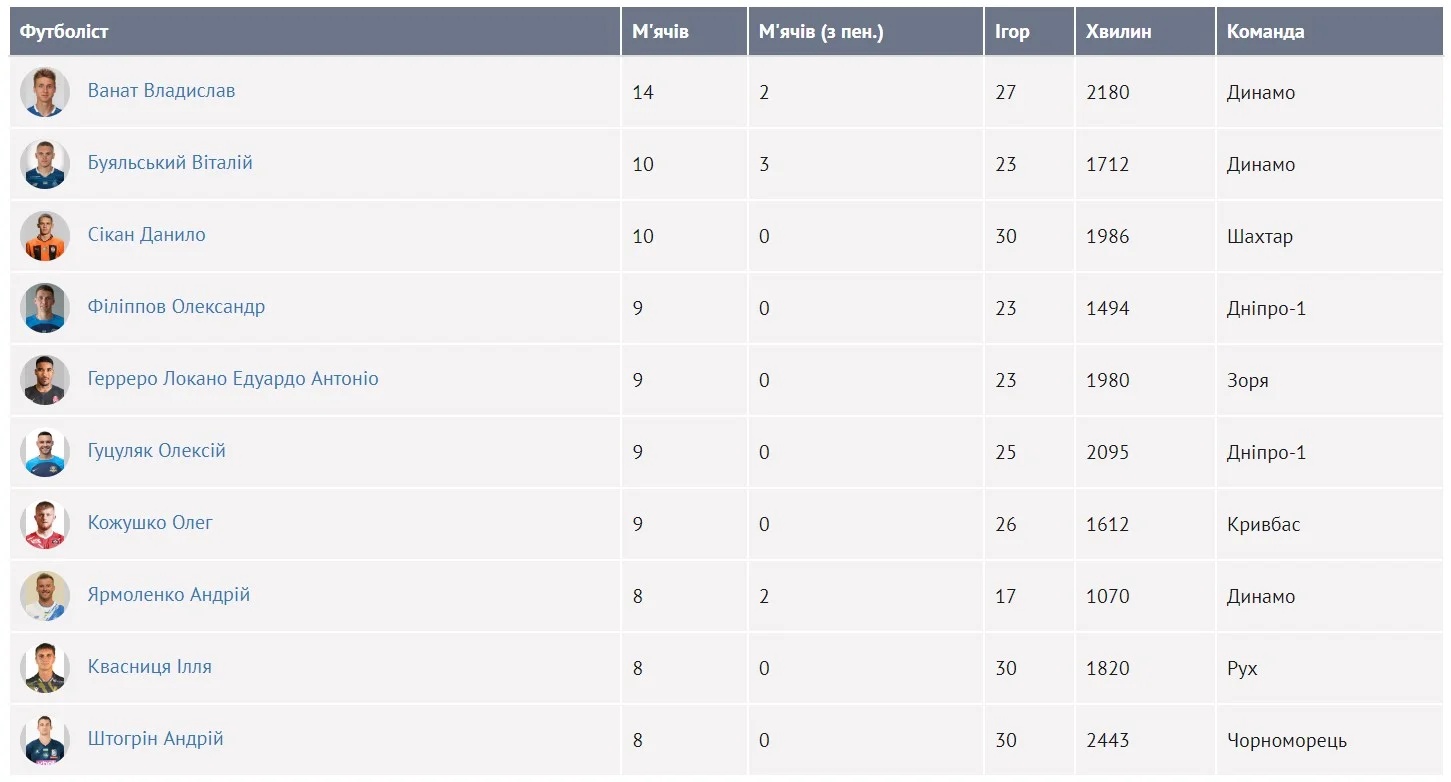 У топ-3 розмістились ще один гравець Динамо, Віталій Буяльський, та форвард Шахтаря Данило Сікан – в обох по 10 голів. Оскільки Буяльський зіграв менше хвилин, хавбека розташували вище за Сікана. Одразу в 4 гравців по 9 забитих м'ячів, зокрема, у представників СК Дніпро-1 Олександра Філіппова та Олексія Гуцуляка. Стільки ж забили Едуардо Герреро (Зоря) та Денис Кожушко (Кривбас).