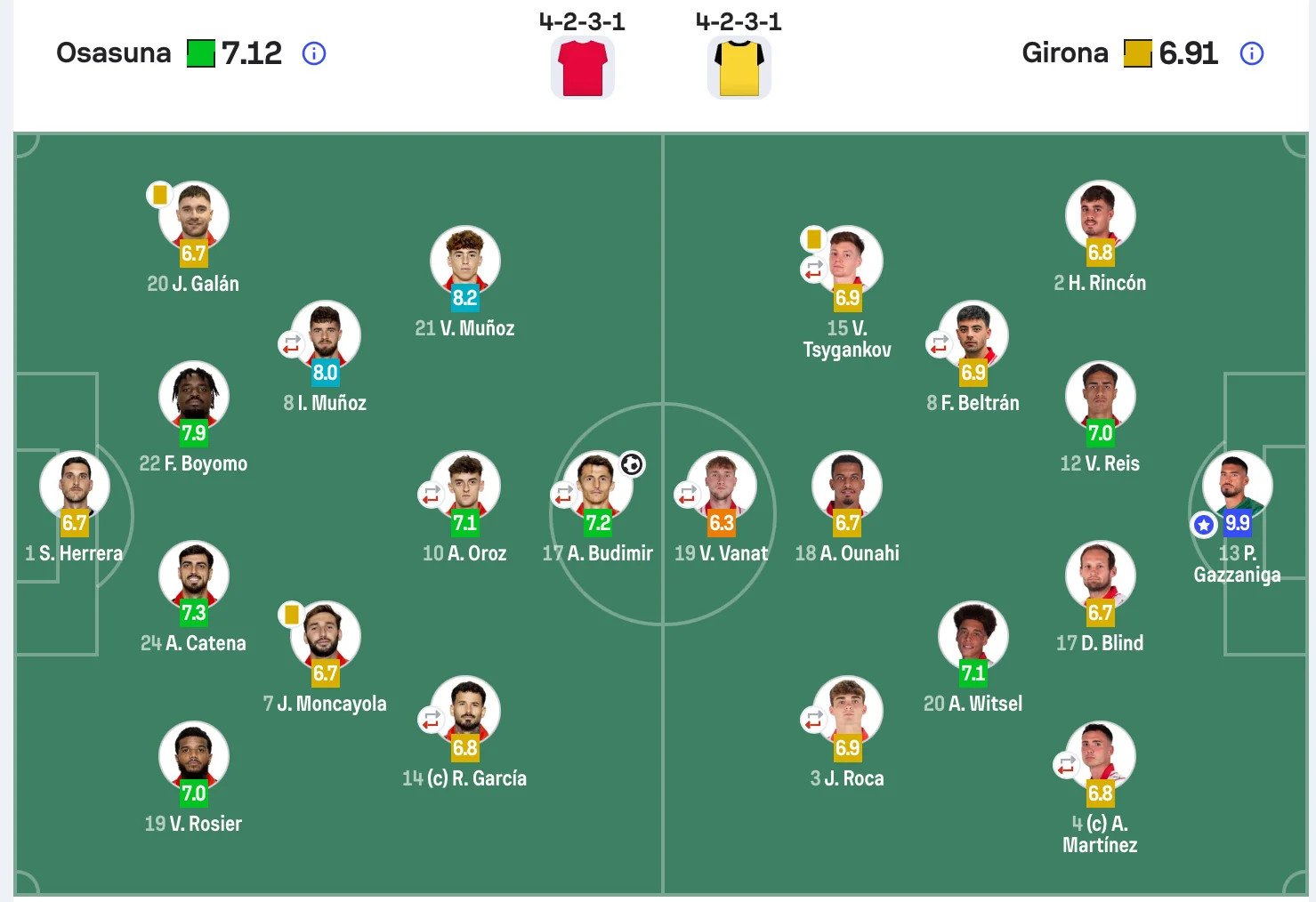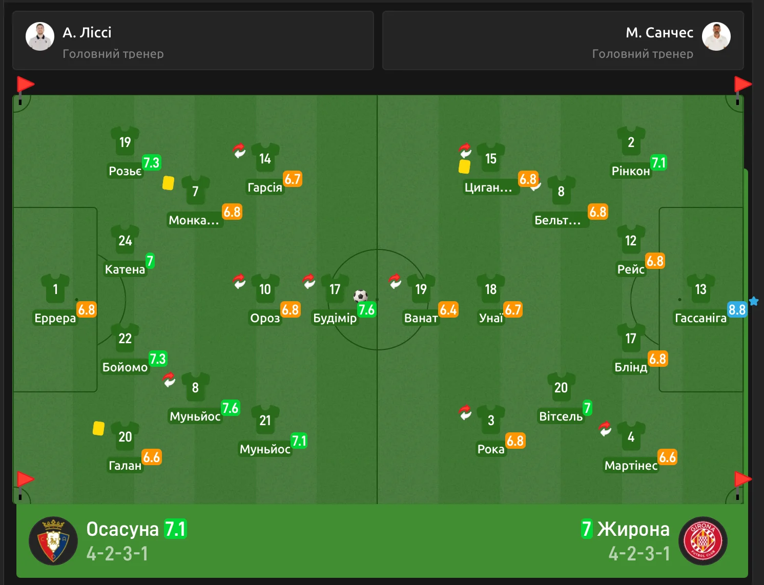 Українські гравці Владислав Ванат та Віктор Циганков вийшли у стартовому складі каталонців, але не відзначилися виразною грою. Статистичні портали традиційно оцінили їхні виступи: Ванат отримав найнижчу оцінку в матчі – 6,4 за версією матч-центру Футбол 24 та 6,3 за даними SofaScore. У обох випадках це найнижчий показник серед усіх гравців команди. Циганков продемонстрував трохи кращу гру – 6,8 та 6,9 відповідно. Найкращим гравцем матчу став голкіпер Жирони Пауло Гассаніга – 8,8 та 9,9.
