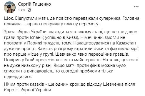 Сергій Тищенко, автор Футбол 24 і Gazeta.ua, передбачає близьку відставку Шевченка.