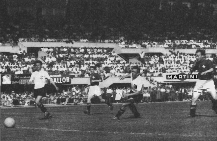 Гол Йозефа Хугі ІІ у ворота австрійців у чвертьфіналі ЧС-1954. На передньому плані – захисники Леопольд Баршандт і Герхард Ханаппі