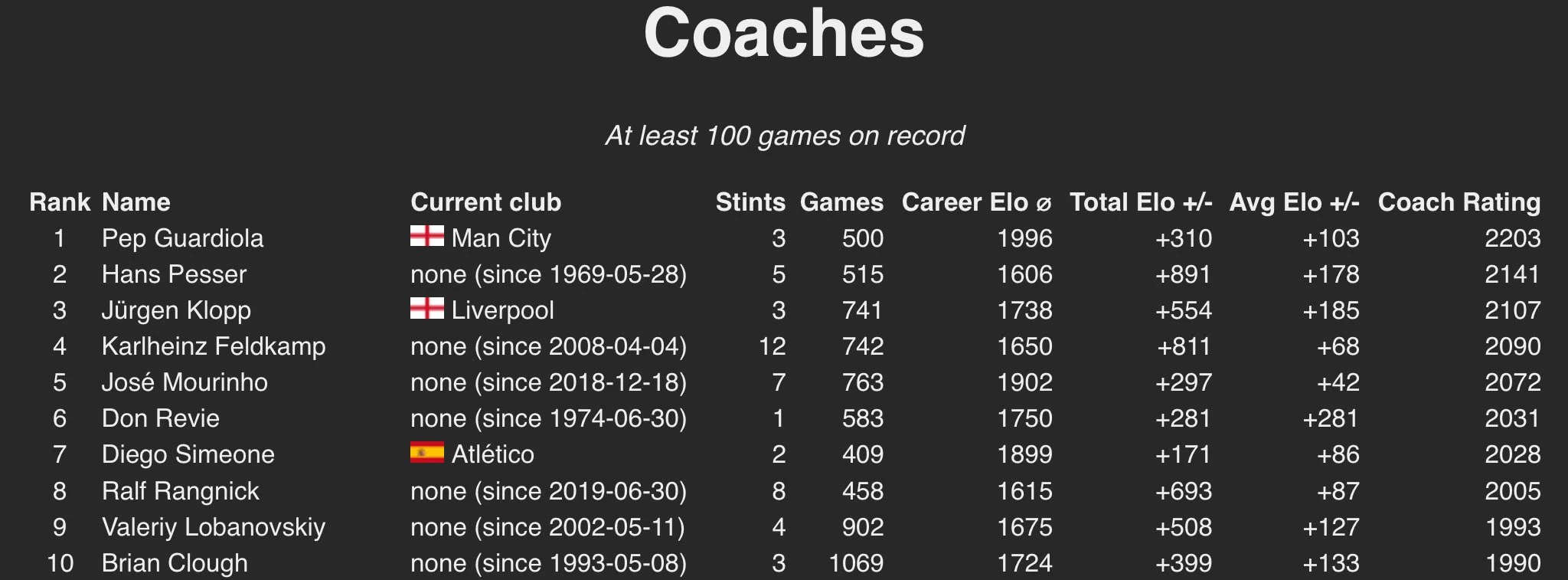 Наскільки це багато? Настільки, що Пессер із 2141 балом у рейтингу Ело і досі посідає друге місце серед усіх тренерів у футбольній історії. Вище за нього тільки Гвардіола – навіть Валерій Лобановський не зміг перегнати Ганса, хоча шість років тому Валерій Васильович у цьому списку йшов третім.