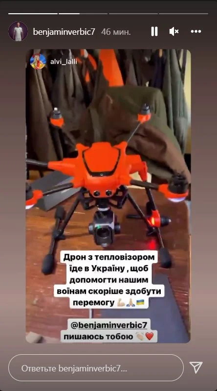 Дівчина Вербіча, Альвіна, виклала у Instagram відео з дроном, який придбав Беньямін. У дописі зазначається, що він розрахований на допомогу ЗСУ.