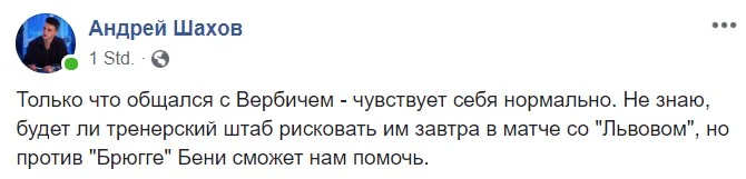 "Щойно спілкувався з Вербічем – почуває себе нормально. Не знаю, чи буде тренерський штаб ризикувати ним завтра в матчі зі Львовом, але проти Брюгге Беньямін зможе нам допомогти", – написав у Facebook близький до Динамо журналіст Андрій Шахов-молодший.