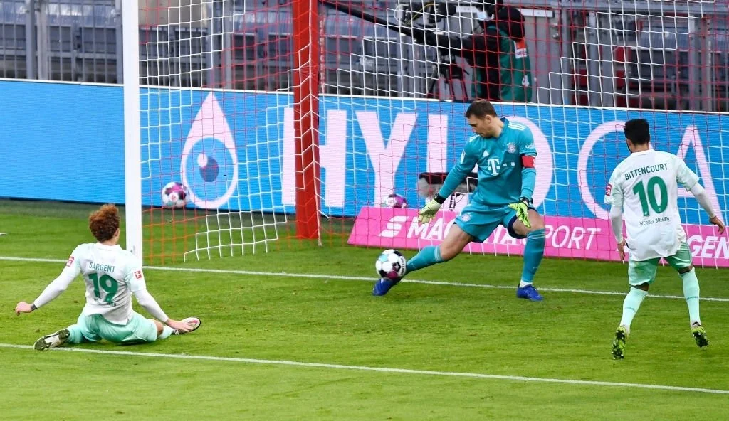Вердер приїхав в гості у Мюнхен. Бременці в останніх чотирьох турах розписали чотири нічиї, однак Баварія не програвала їм вже 12 років, причому з 2010-го "музики" не відібрали жодного очка. Втім, сьогоднішній поєдинок виявився непростим: вже на 19-й хвилині травму отримав Ернандес, якого змінив Горецка, а на 45-й гості вийшли вперед внаслідок прострілу Сарджента з правого флангу – Еггештайн замкнув його ударом у дальній нижній кут. 0:1!