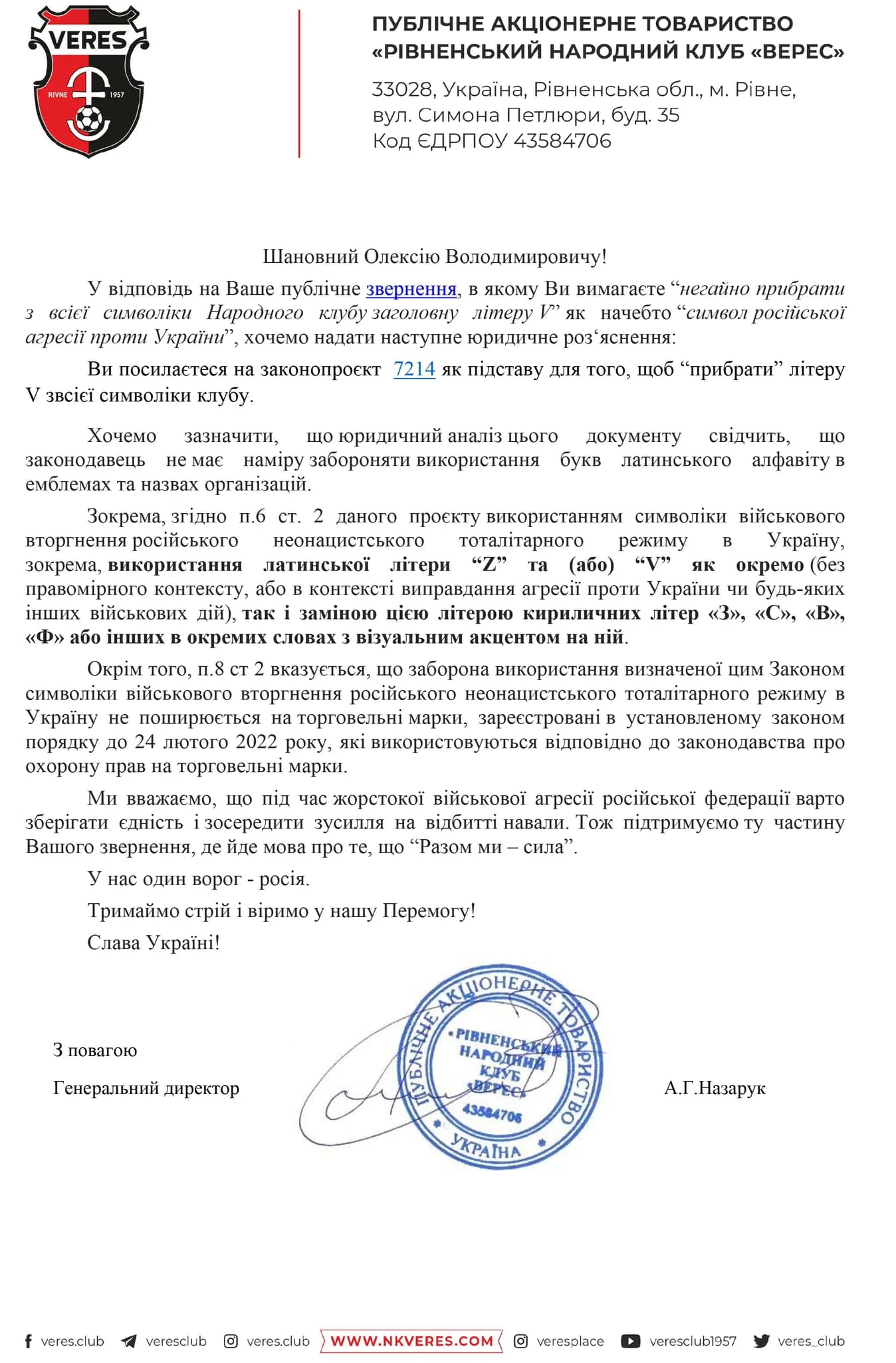 Цього тижня колишній президент Вереса Олексій Хахльов закликав прибрати з символіки команди літеру "V", мовляв, задля запобігання погіршення репутації й уникнення проблем зі законом, що забороняє використання символіки військового вторгнення російського неонацистського режиму в Україну.