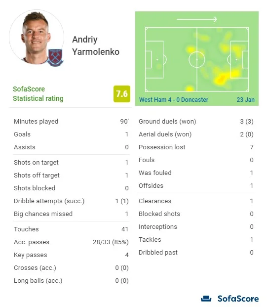 Андрій Ярмоленко – гравець ротації Вест Хема. Він виходить на заміну в АПЛ і грає з перших хвилин матчі другорядних турнірів. На тижні українець добре проявив себе у чемпіонаті, виконавши асист під переможний гол, тому його поява в стартовому складі проти Донкастера не викликала жодних сумнівів.