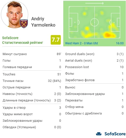 Аналітичний портал SofaScore не помітив у Андрія жодного обіграшу за 88 хвилин гри (Матіча він все-таки розхитав на славу – прогавили), але саме наш футболіст найчастіше пробивав по воротах Де Хеа, та ще й зі стовідсотковою влучністю – три спроби, один гол. Ярмоленко класно відкривався, а партнери не шкодували для нього хороших передач. Схоже, що оборона МЮ виявилась не готовою до різнобічної версії Андрія, який не лише несеться до лицевої та зміщується до центру під робочу ліву, але й ефективно працює без м'яча, відкриваючись за спинами у захисників. Останній "трюк" застав зненацька супердосвідченого Янга, який проспав ривок Ярмоленка під час першого гола, та найдорожчого захисника світу.