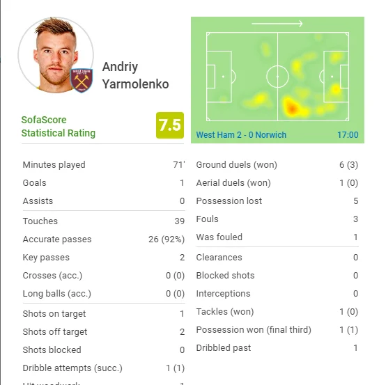 Аллє виграв верхову боротьбу – захисник Норвіча вибив з лінії воріт. Ярмоленко виявився першим на підбиранні і знову спробував ударом з льоту. Цього разу дуже невлучно. Сходить Андрій з поля на 71-й хвилині. Нарешті українець знову зриває овації домашнього стадіону Вест Хема. Приємно, що не здається і набуває впевненості наперекір усім проблемам.
