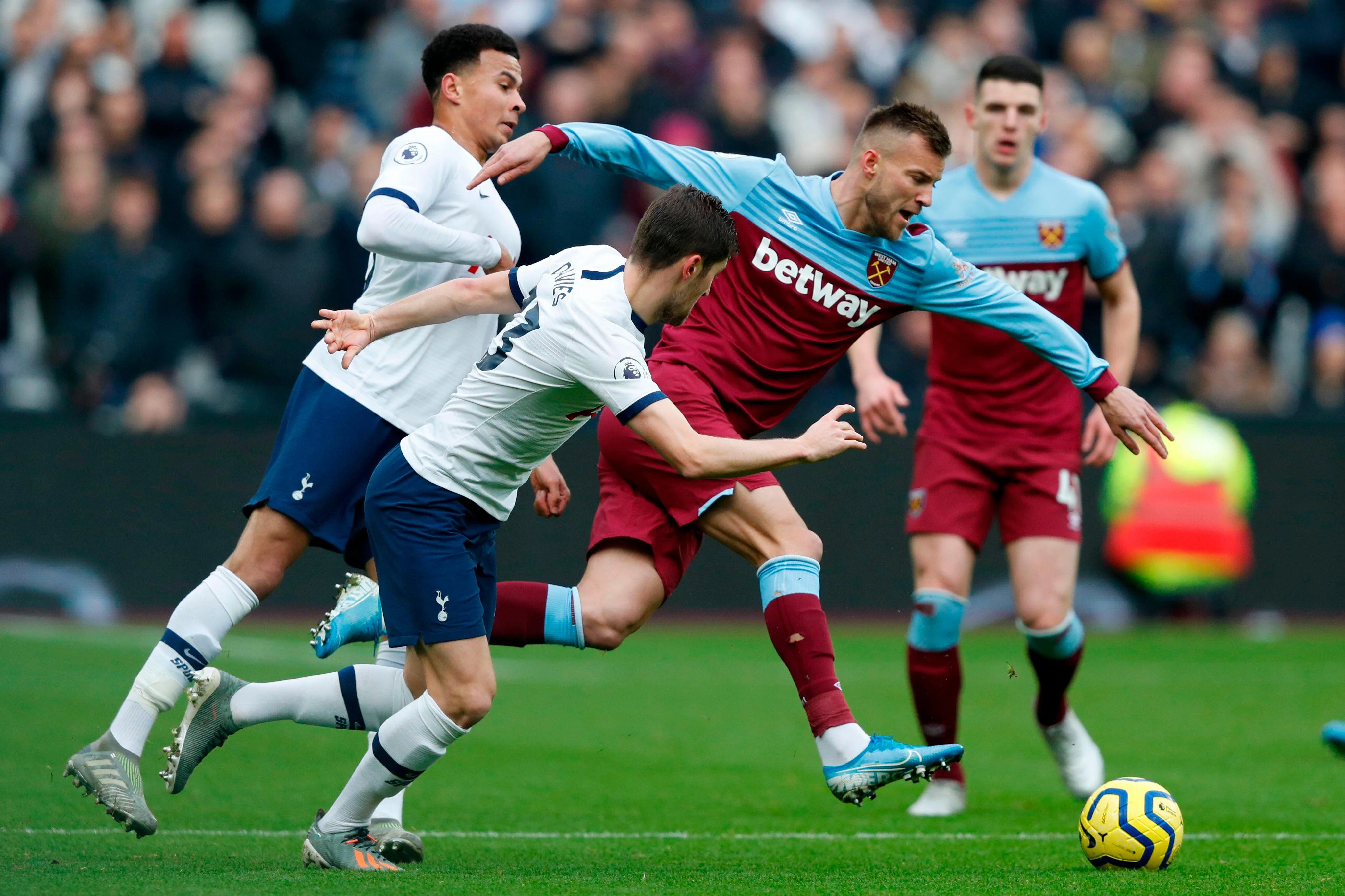 До середини першої половини "шпори" серйозно взяли м'яч під свій контроль, але особливо гру не загострювали. За це їх могли покарати "молотки" – Ярмоленко зряче навішував у район лінії воротарського майданчика, але Снодграс програв силову боротьбу Ор'є і не зміг завдати удару. Тоттенхем відповів своєю напівнагодою, але Огбонна вчасно перервав гостру передачу Аллі.