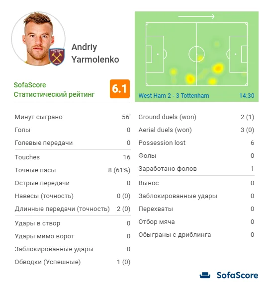 Українець провів на полі 56 хвилин і відверто не вразив. Наприклад, статистичний портал SofaScore поставив вінгеру скромний бал 6,1. Більшість небезпечних ситуацій біля воріт Вест Хема виникала після невдалих дій на правому фланзі, де грала зв'язка Фредерікс-Ярмоленко. Саме звідси прийшов другий гол Тоттенхема, коли Нобл не підстрахував українця (він був в атаці), а Фредерікс не дограв епізод до кінця. Всього в активі Ярмоленка 16 дотиків до м'яча. 30-річний вінгер віддав 8 точних пасів (61 % від усіх), 6 разів втратив м'яч, а з п'яти дуелей виграв лише одну. З позитиву – 1 зароблений на собі фол. Таку ж оцінку, як Андрій Ярмоленко, отримали голкіпер Роберто Хіменес і вінгер Феліпе Андерсон. Гірше відіграв лише один гравець – центрбек Ісса Діоп (5,7).
