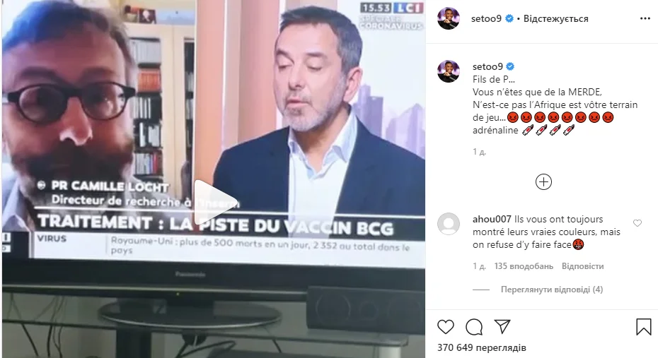 В ефірі французького каналу LCI двоє лікарів мали необачність дискутувати про випробування вакцини від COVID-19 на громадянах африканського континенту. Їхні слова викликали справжню буру в соцмережах, до критики цих ідей приєдналися навіть найбільші легенди збірних Камеруну, Кот-д'Івуару тощо – Самюель Ето'О, Дідьє Дрогба та інші знамениті футболісти. Жан-Поль Міра та Каміль Лохт, зокрема, запропонували використати оригінальний досвід минулого.