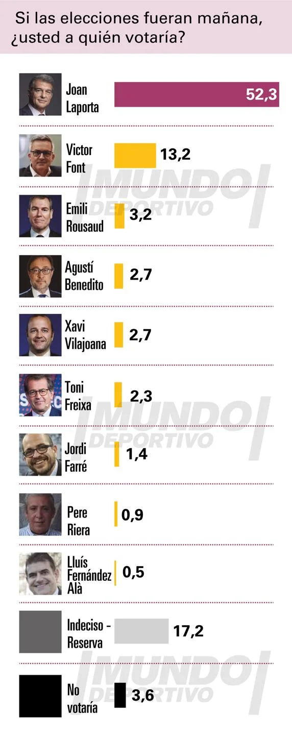 Фонт і його платформа "Sí al futur" фінішували б другими з катастрофічним відставанням (13,2%). Скандальний представник хунти Бартомеу Емілі Русо (3,2%), Агусті Бенедіто (2,7%), Хаві Вілажоана (2,7 %), Тоні Фрейкса (2,3%) і Жорді Фарре (1,4%) взагалі не вражають електорат. Ні безкоштовні тату, ні смачненька піца від найкращого кухаря світу – уболівальники мріють про нову переможну еру, і їх не обведеш навколо пальця дешевим маркетингом. Слід зазначити, що з 220-ти опитаних "сосіос" 17,2% наразі не визначились, а ще 3,6% – не мають наміру йти на вибори.