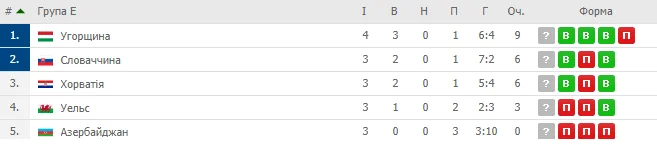 А в центральному матчі групи Е угорці мінімально здолали команду Уельсу вдома. Єдиний м'яч на 81-й хвилині провів Мате Паткай, який другим темпом завершив класну атаку господарів. Ця перемога дозволила збірній Угорщини повернути лідерство, випередивши словаків і хорватів.