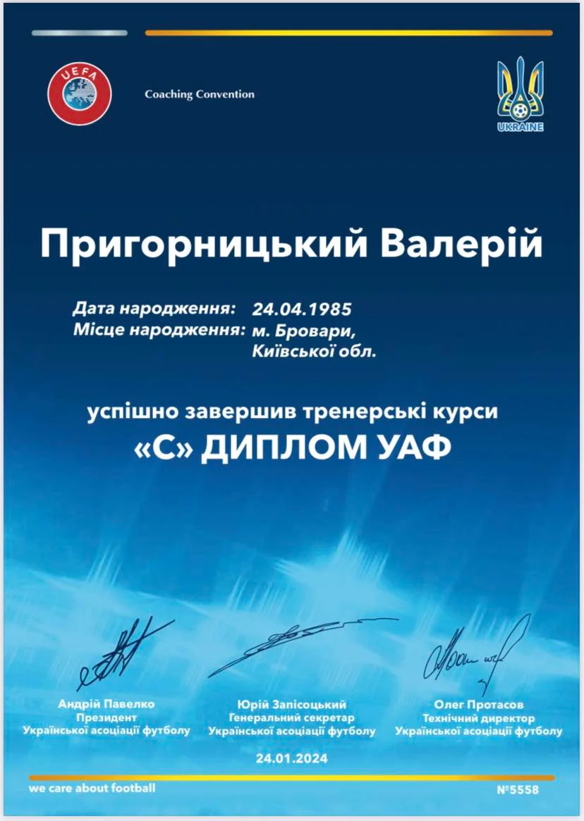 Щоб стати тренером, вам потрібно отримати тренерську ліцензію УЄФА. Для цього необхідно пройти навчання у Центрі ліцензування УАФ. Першою сходинкою на шляху тренера є отримання ліцензії "С". Власники ліцензії "С" можуть працювати з дітьми, які виступають у Дитячо-юнацькій футбольній лізі України.