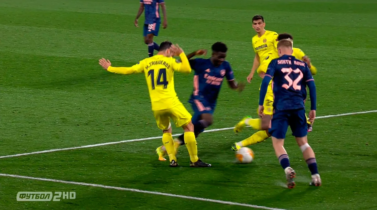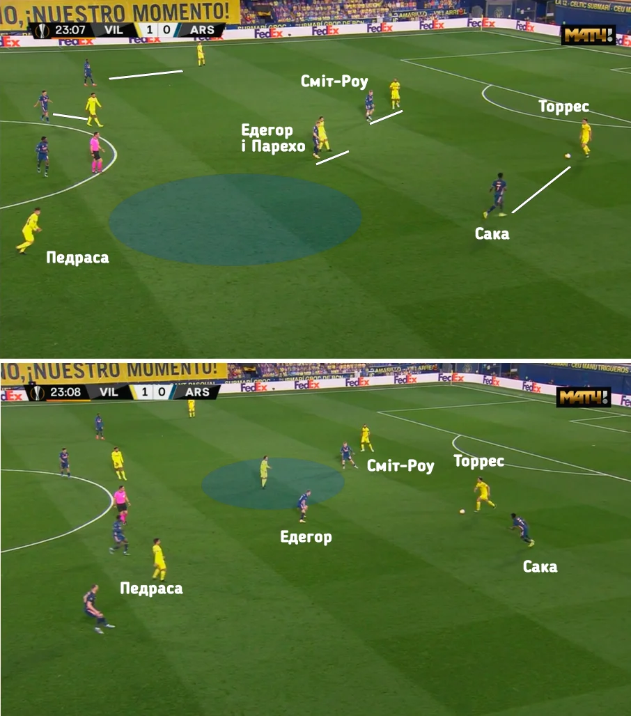 Подібні ситуації виникали регулярно. Всього одна-дві передачі взад-поперек відкривали партнера по команді на фланзі чи в центрі поля – пресинг Арсенала виявився провальним. Наприклад, на 21-й хвилині грамотний тиск 3-в-3 всього за секунду завершився створенням варіанту передачі на Парехо. Пау Торрес затягнув з пасом, але Сака так довго наважувався на атаку центрбека, що той спокійно віддав на Педрасу.