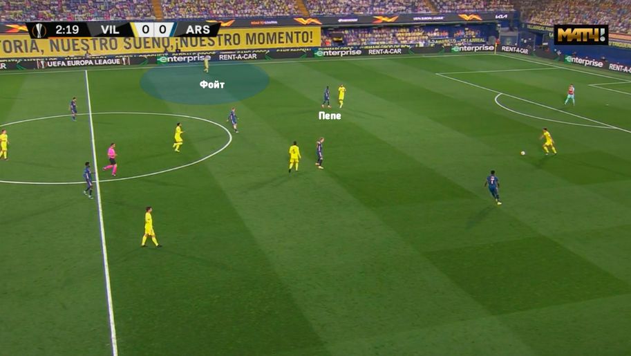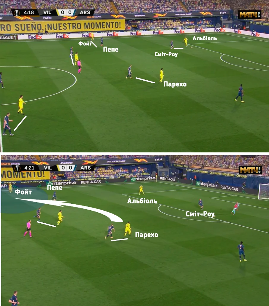 Так, перший забитий м'яч розпочався з помилки Пепе при командному пресингу. Спочатку всі дисципліновано грали з іспанцями один-в-один, але передача назад на голкіпера розбила тиск гостей – Сміт-Роу кинув Альбіоля й атакував Рульї, а Пепе розірвався між завданнями. У підсумку Ніколя і до Альбіоля не дійшов, і швидкого Фойта залишив за спиною. Парехо ж, отримавши пас під тиском опорників, всього одним переведенням відрізав половину Арсенала, запустивши Фойта в прохід правим флангом. Далі Хуан віддасть пас на Чуквуезе, після чого станеться гол.