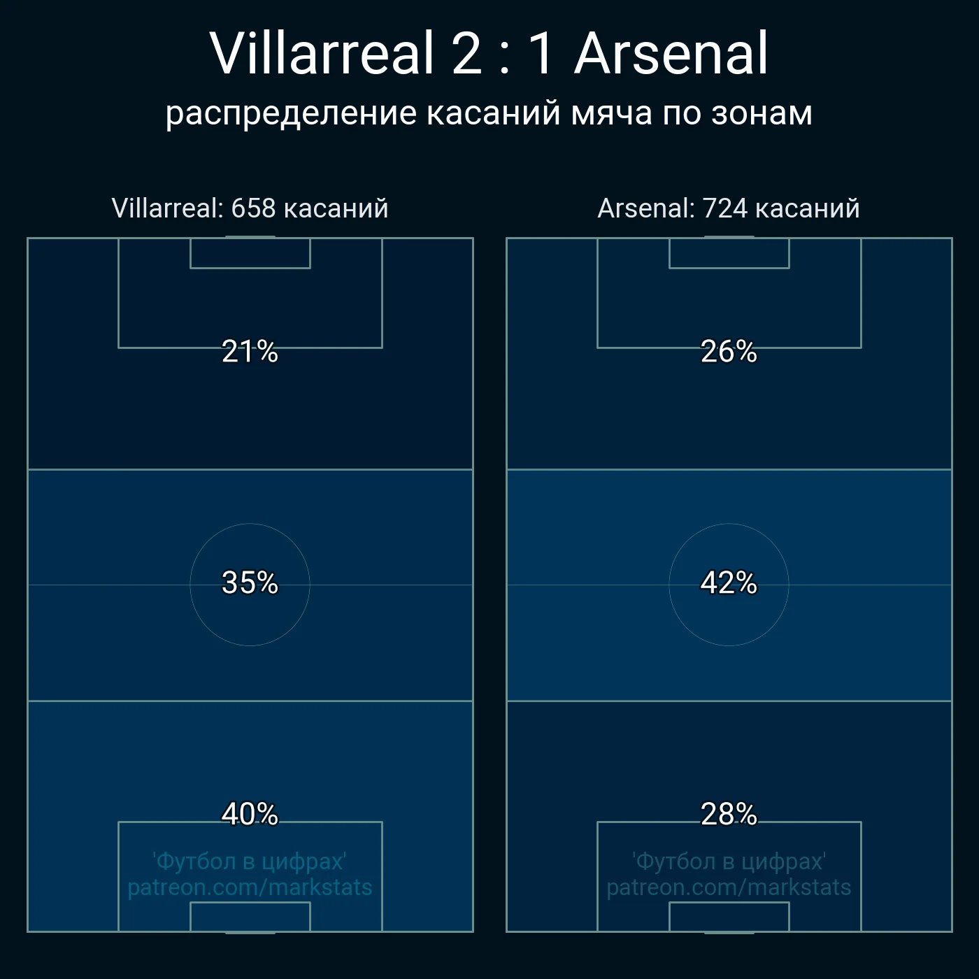 Статистично клас Арсенала також помітний. Так, підопічні Мікеля Артети провалили зустріч в організаційному плані, ледь не зазнавши розгрому, але по цифрах у команд все більш-менш рівно – 9:9 за ударами (7:7 з меж штрафного), 10:8 за передачами в карний майданчик, 29:25 за дотиками у ньому, 0,91 vs 1,23 за гостротою пасів, 83% vs 84% за точністю пасів. Гості навіть більше працювали на чужій половині й перевершили суперника у володінні (55%), хоча грали у меншості. За інтенсивністю пресингу Арсенал теж був кращим, не дозволяючи іспанцям зробити більше 8,6 передач у 40 метрах від чужих воріт (у Вільяреала цей показник становить 9,1)