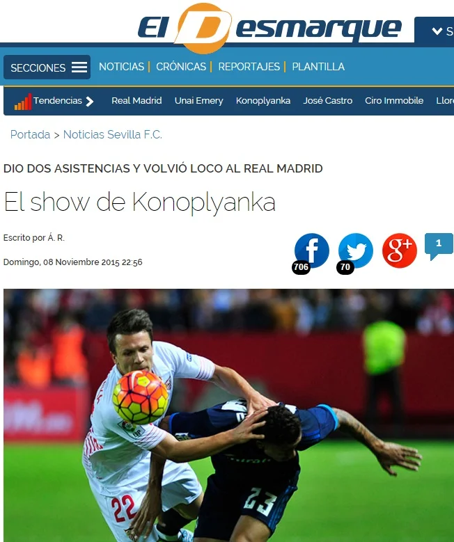 Індивідуальні дії Коноплянки, коли "Севілья" забивала другий гол, вважає ключовими у матчі і видання AS. Крім цього, мадридські журналісти відзначають постійні переміщення українського хавбека, які не давали спокою обороні "Реала".