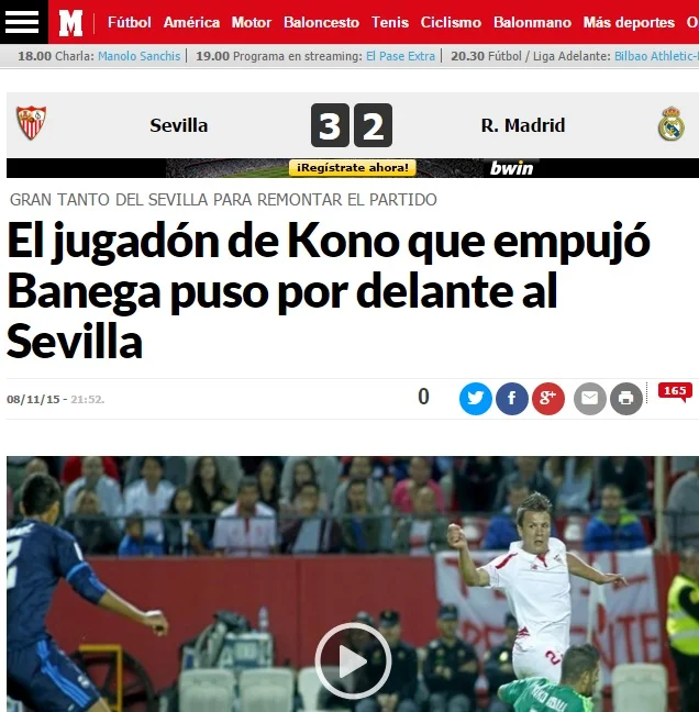 Мадридське видання Marca також із захопленням пише про гру Коно і ставить йому за матч найвищий бал серед гравців двох команд (8). Marca виділяє епізод із голом Банеги, коли Коноплянка розірвав оборону "Реала" та віддав геніальну передачу на аргентинця. "Індивідуальні дії українця у цей момент вирішили долю матчу", - відзначає рупор мадридської преси.